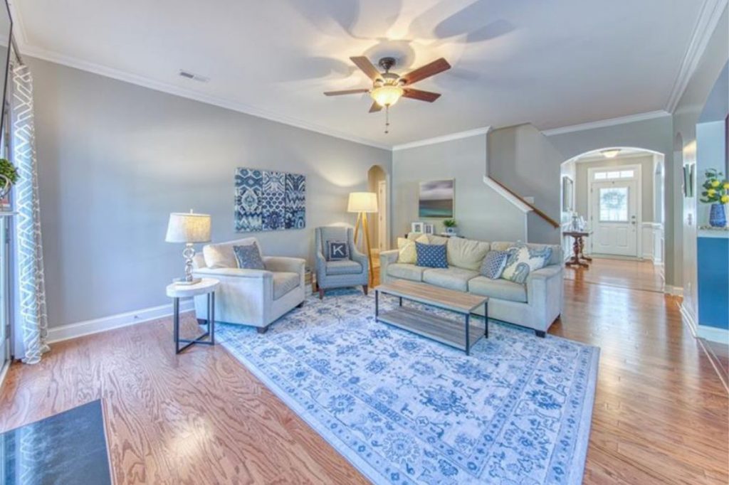 Chinoiserie brings a fresh yet timeless look. This traditional print can highlight your space in the form of decorative vases and jars, pillow and curtain fabric or even full carpets as seen in the bright living room above.