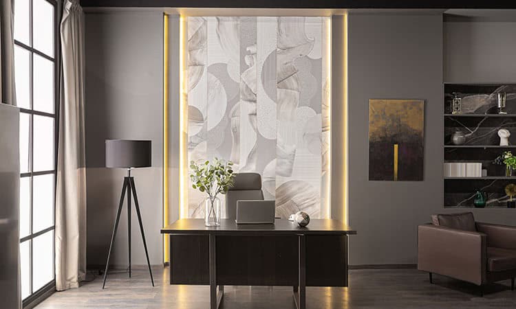 When sitting at a desk, it’s easy to think about the horizontal elements of your home office’s design: the open desk space, open floor space, and even a side table. But don’t neglect the vertical space! Adding a few floating shelves above your desk is a great way to keep office supplies close without crowding you. A wall sconce could even free up the space your desk lamp is using right now. We’re also big fans of bulletin boards and pin boards, floating storage options, as well as gallery walls. Use wall art to create “windows” into inspiring places.